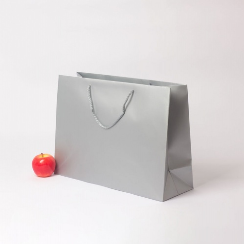 Пакеты бумажные 47х34х16см, цвет - серебро, материал - мелованная бумага, ламинация - матовая, ручки - шнур, фото 1 (вид спереди)