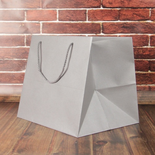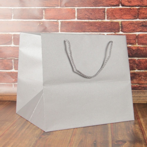 Пакеты бумажные 33х30х28см, цвет - серебро, материал - плотный крафт, ламинация - без ламинации, ручки - шнур, фото 1 (вид спереди)