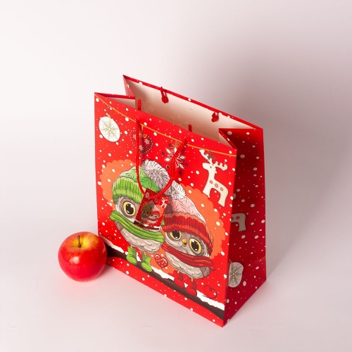 Пакеты бумажные 26х32х12см, цвет - красный, материал - мелованная бумага, ламинация - глянец, ручки - шнур, фото 1 (вид спереди)
