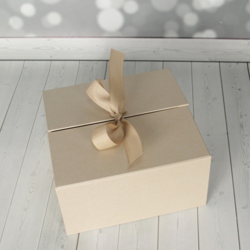 Кашированные коробки 18х9х18см, цвет - бежевый, материал - дизайнерская бумага, ламинация - без ламинации, ручки - лента репсовая, фото 1 (вид спереди)