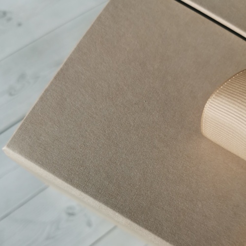 Кашированные коробки 18х9х18см, цвет - бежевый, материал - дизайнерская бумага, ламинация - без ламинации, ручки - лента репсовая, фото 2